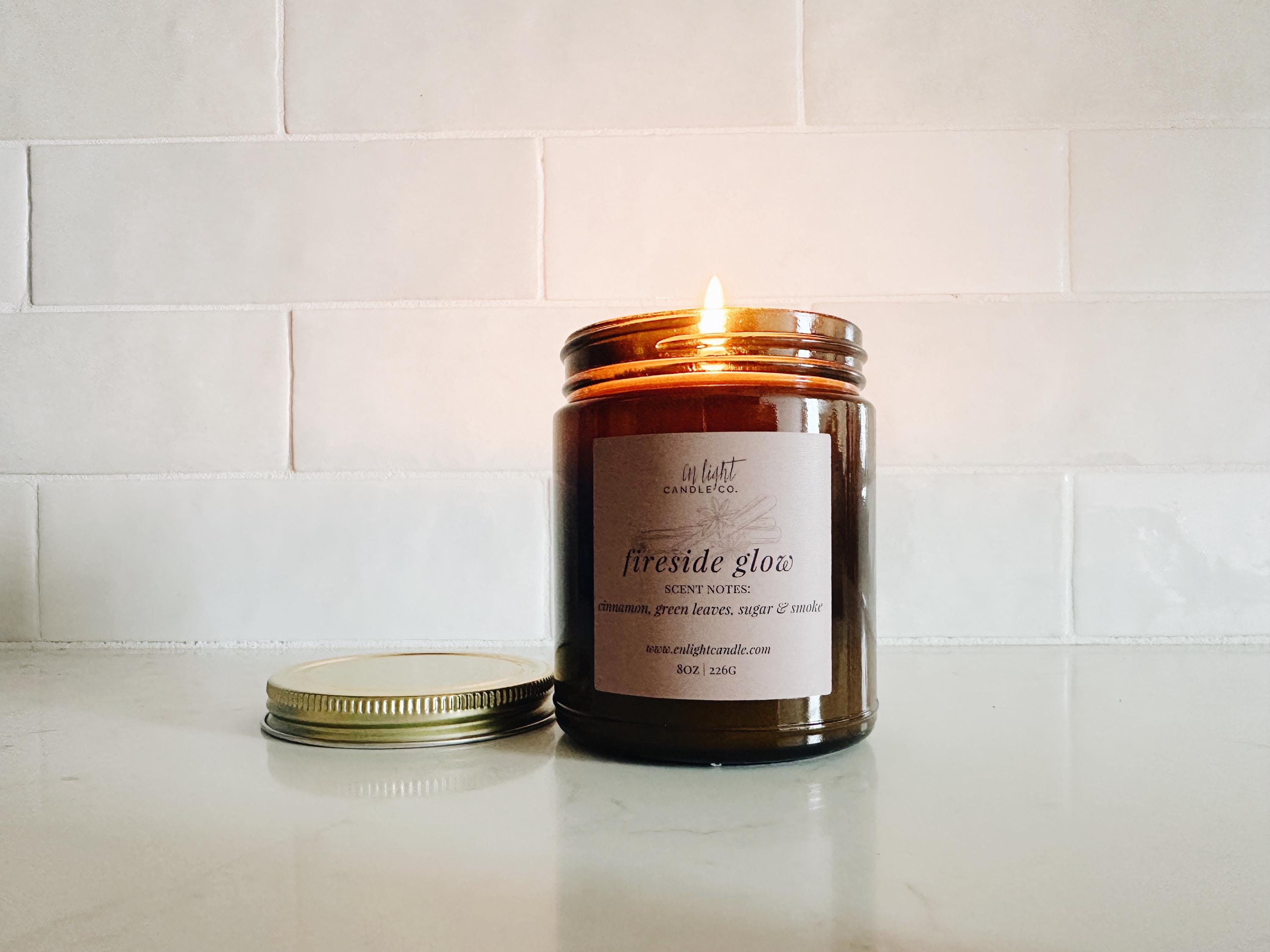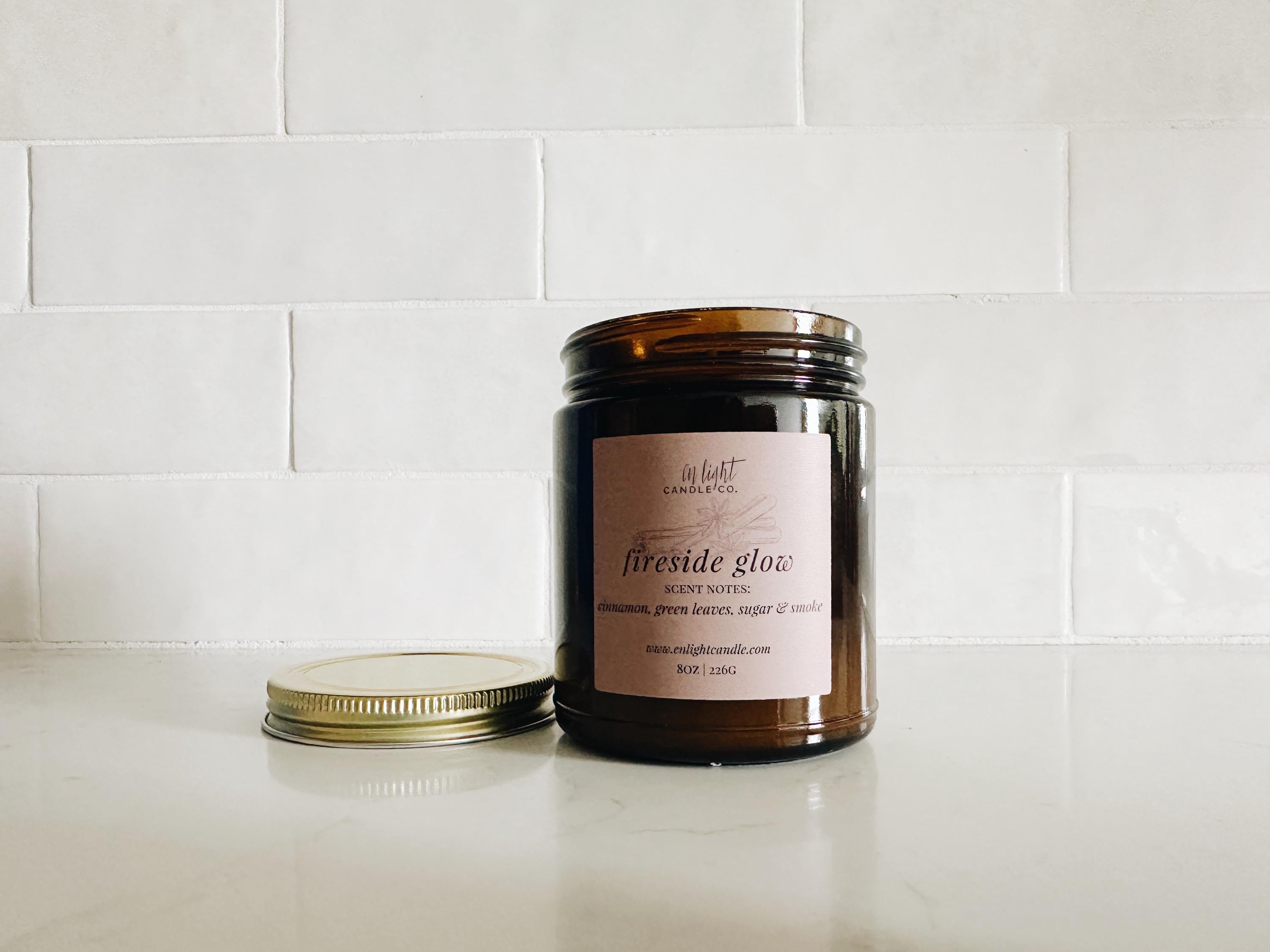 Fireside Glow | 8 oz pure soy candle with lid | cinnamon, green leaves, sugar & smoke