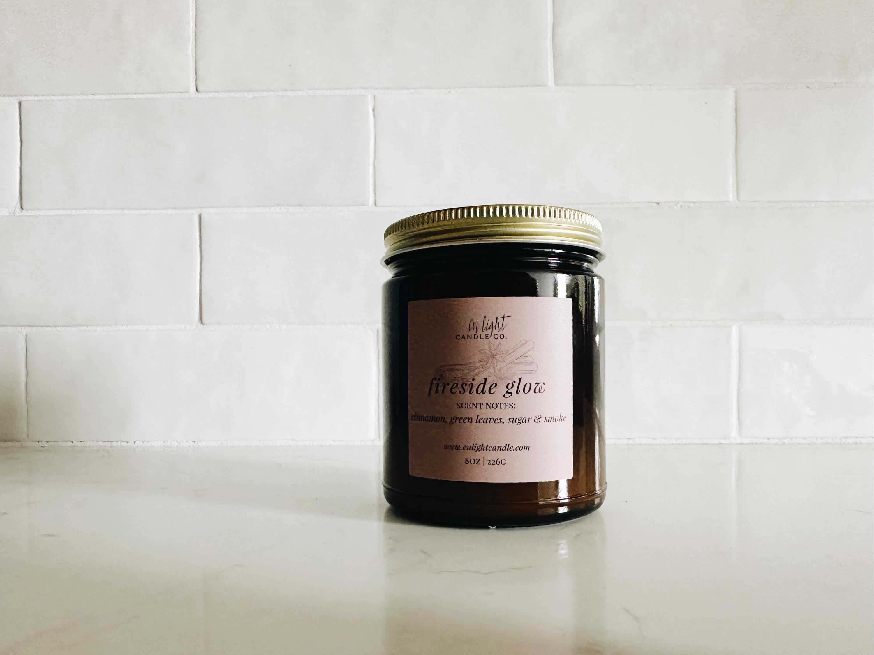 Fireside Glow | Our newest scent made of the sweetest combination of Cinnamon, Green Leaves, Sugar and a touch of Smoke. the result is a warm and cozy candle that in inviting, spicy and delicious. It’s a great scent to transition from fall to winter and would be great to burn into the new year.